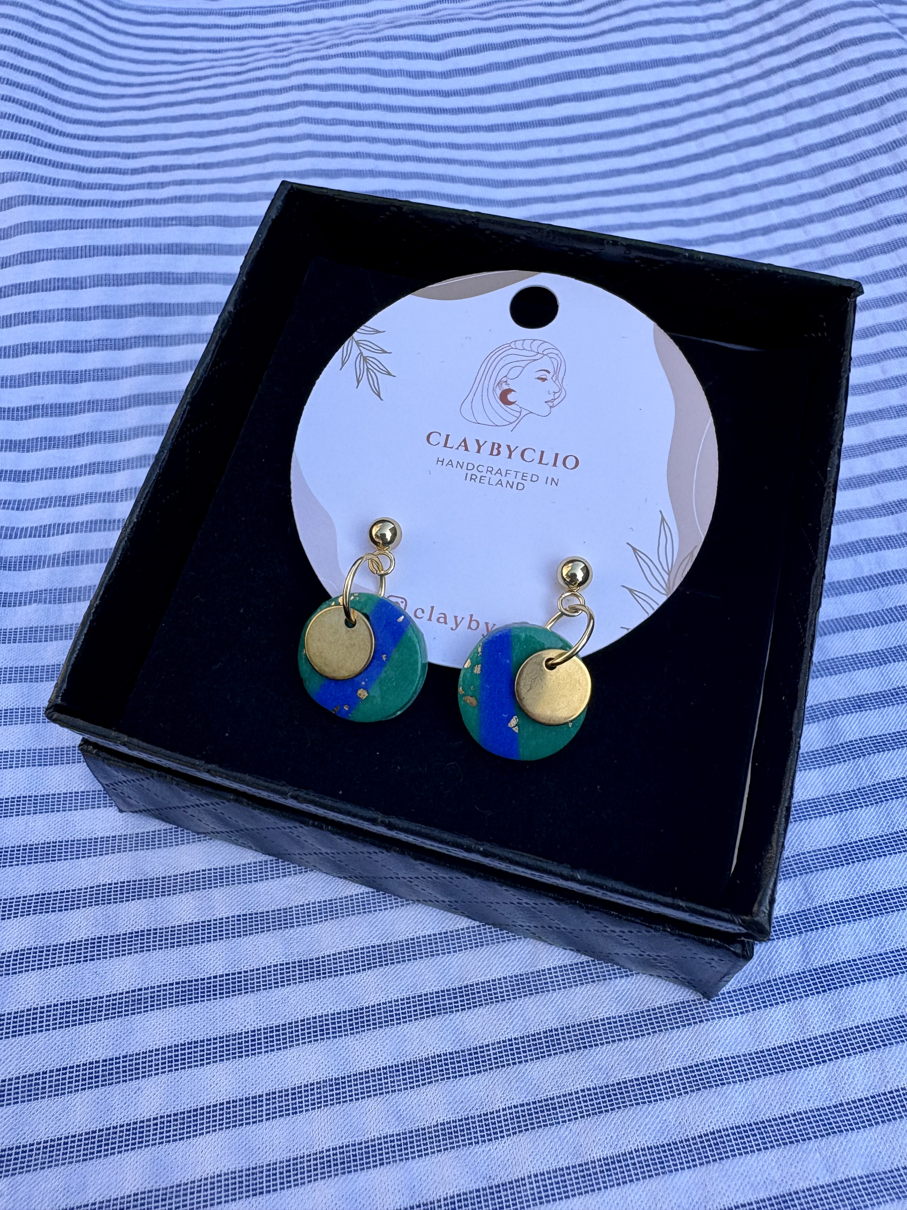 She makes these gorgous earrings in very small batches to keep them unique. Clio works with polymer clay and says to always store them in a box if traveling to protect, never stack or crush. The fixings and findings are all made from stainless steel. Comes in these gorgeous black gift boxes.