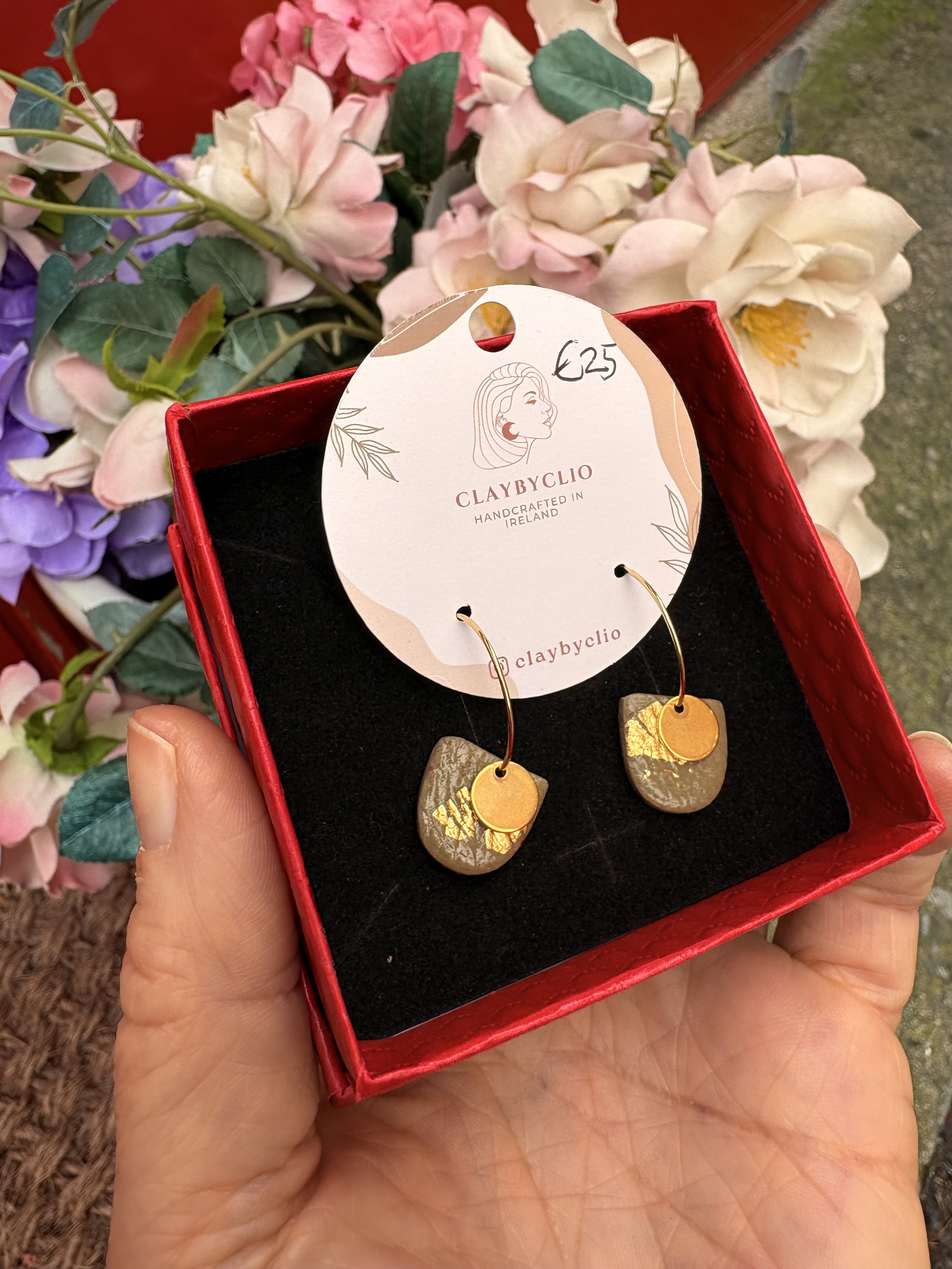 She makes these gorgous earrings in very small batches to keep them unique. Clio works with polymer clay and says to always store them in a box if traveling to protect, never stack or crush. The fixings and findings are all made from stainless steel. Comes in these gorgeous black gift boxes.