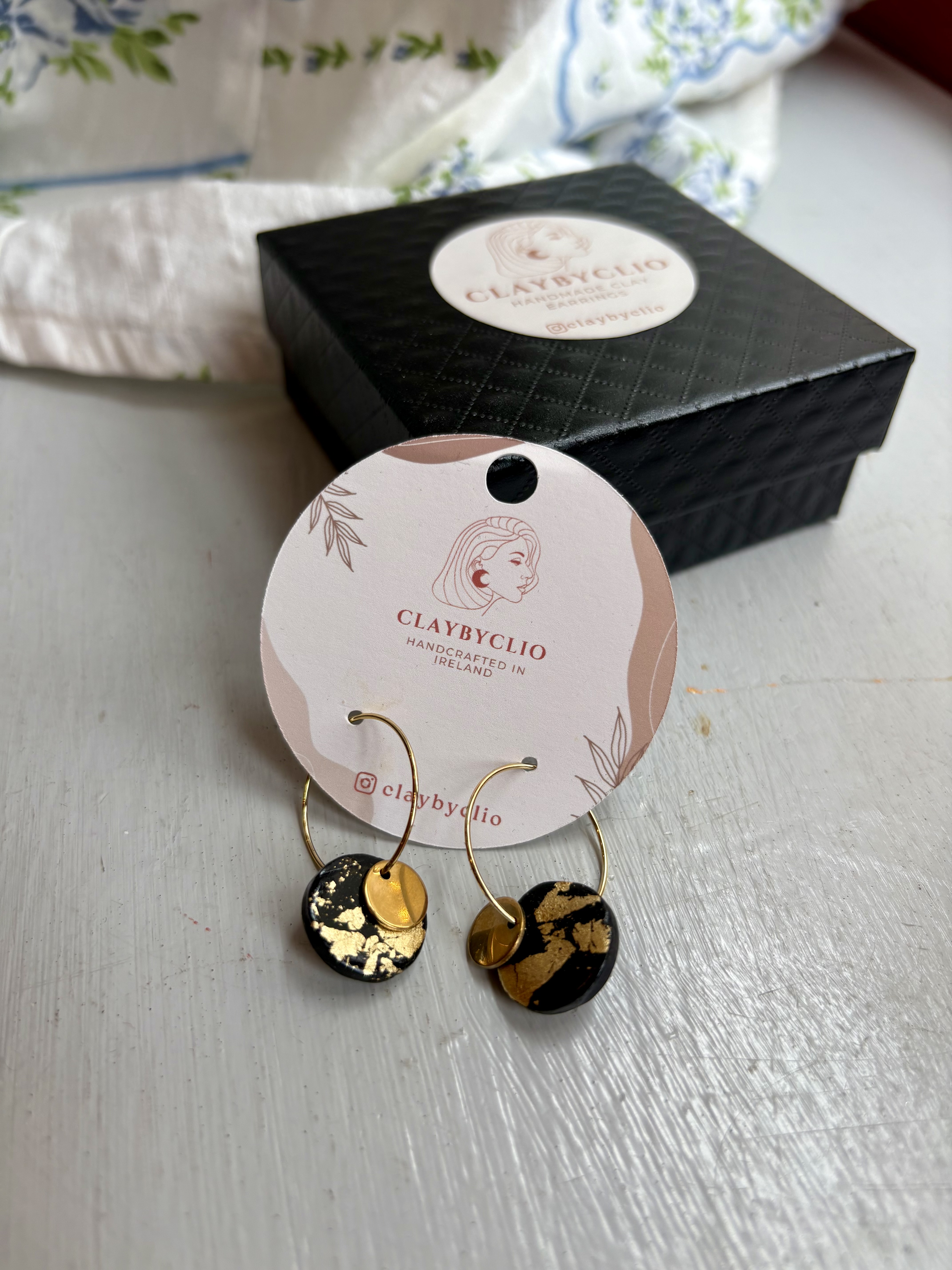 She makes these gorgous earrings in very small batches to keep them unique. Clio works with polymer clay and says to always store them in a box if traveling to protect, never stack or crush. The fixings and findings are all made from stainless steel. Comes in these gorgeous black gift boxes.