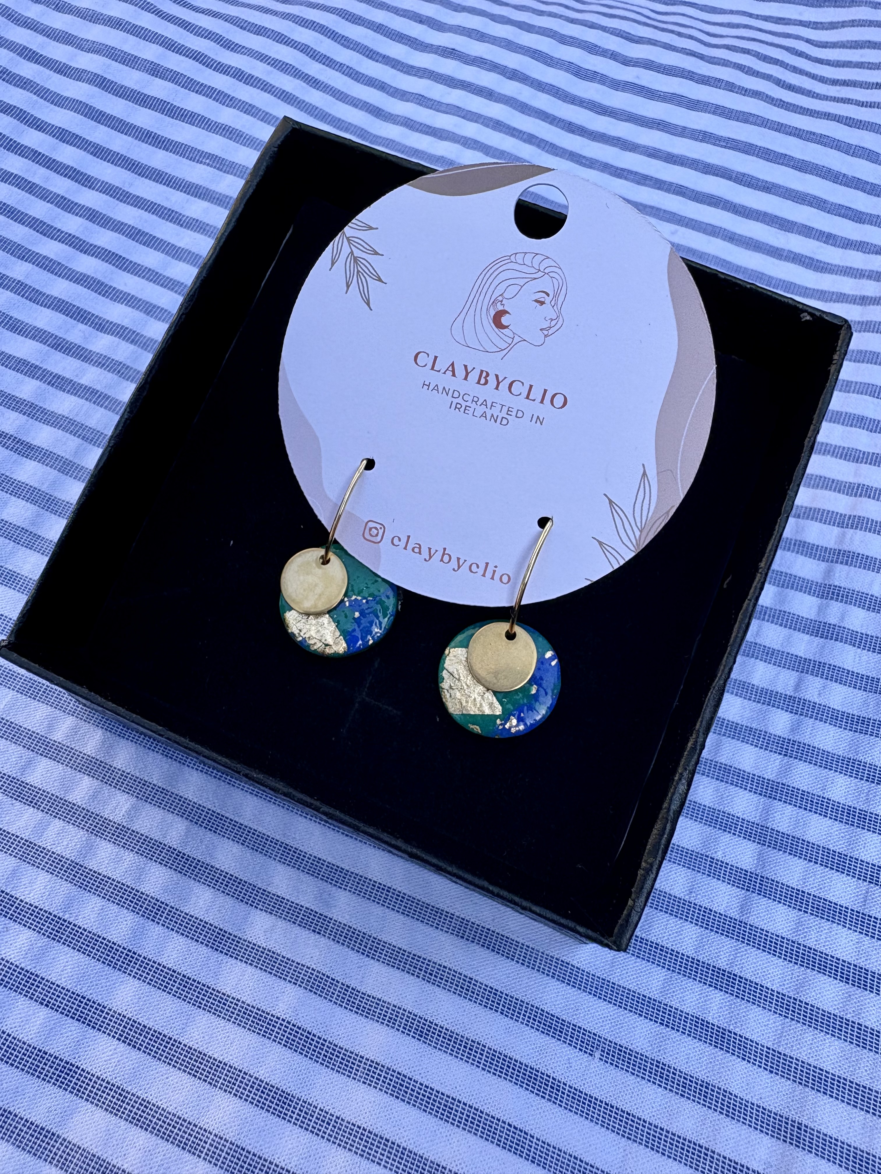 She makes these gorgous earrings in very small batches to keep them unique. Clio works with polymer clay and says to always store them in a box if traveling to protect, never stack or crush. The fixings and findings are all made from stainless steel. Comes in these gorgeous black gift boxes.