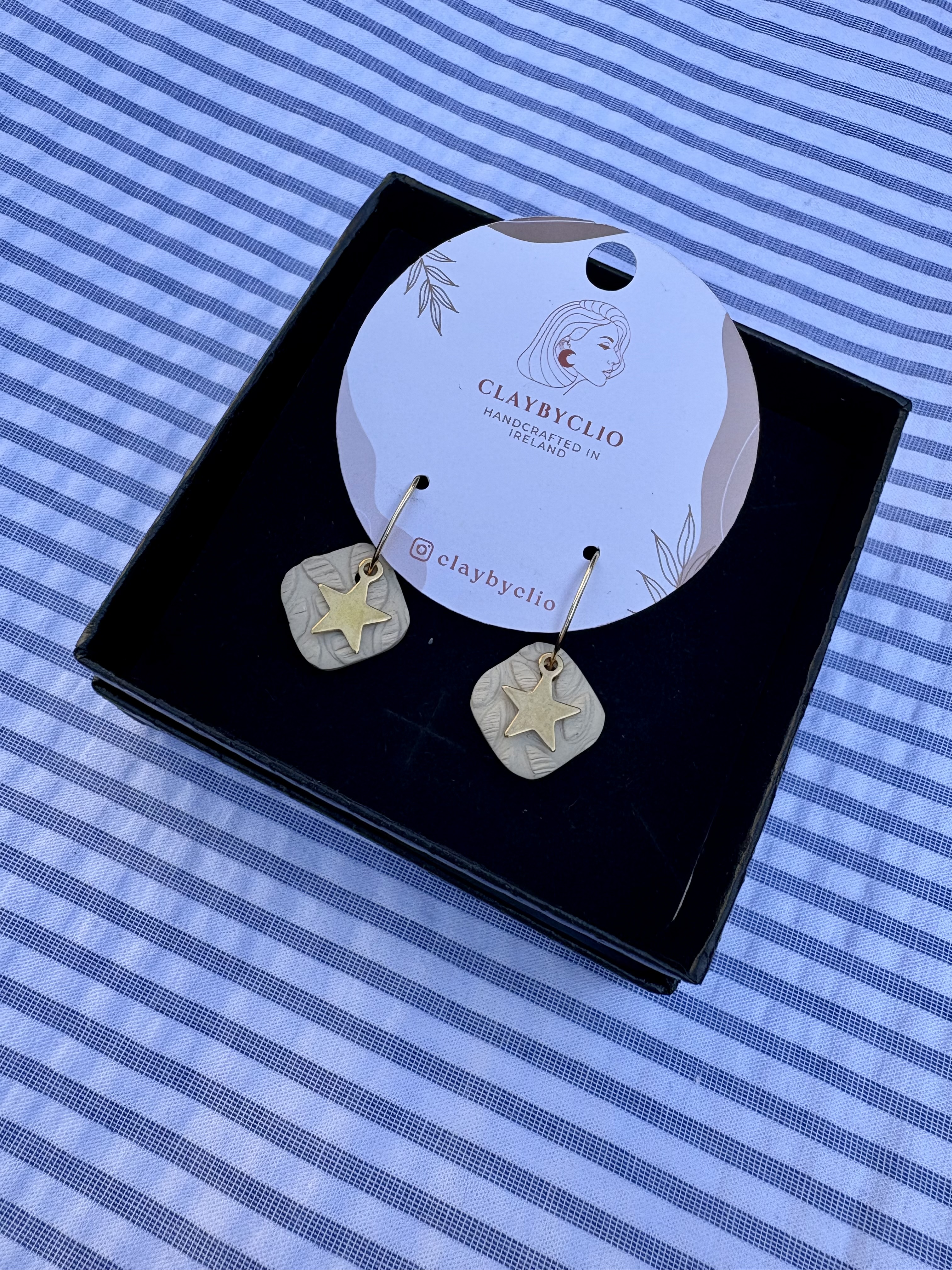 She makes these gorgous earrings in very small batches to keep them unique. Clio works with polymer clay and says to always store them in a box if traveling to protect, never stack or crush. The fixings and findings are all made from stainless steel. Comes in these gorgeous black gift boxes.