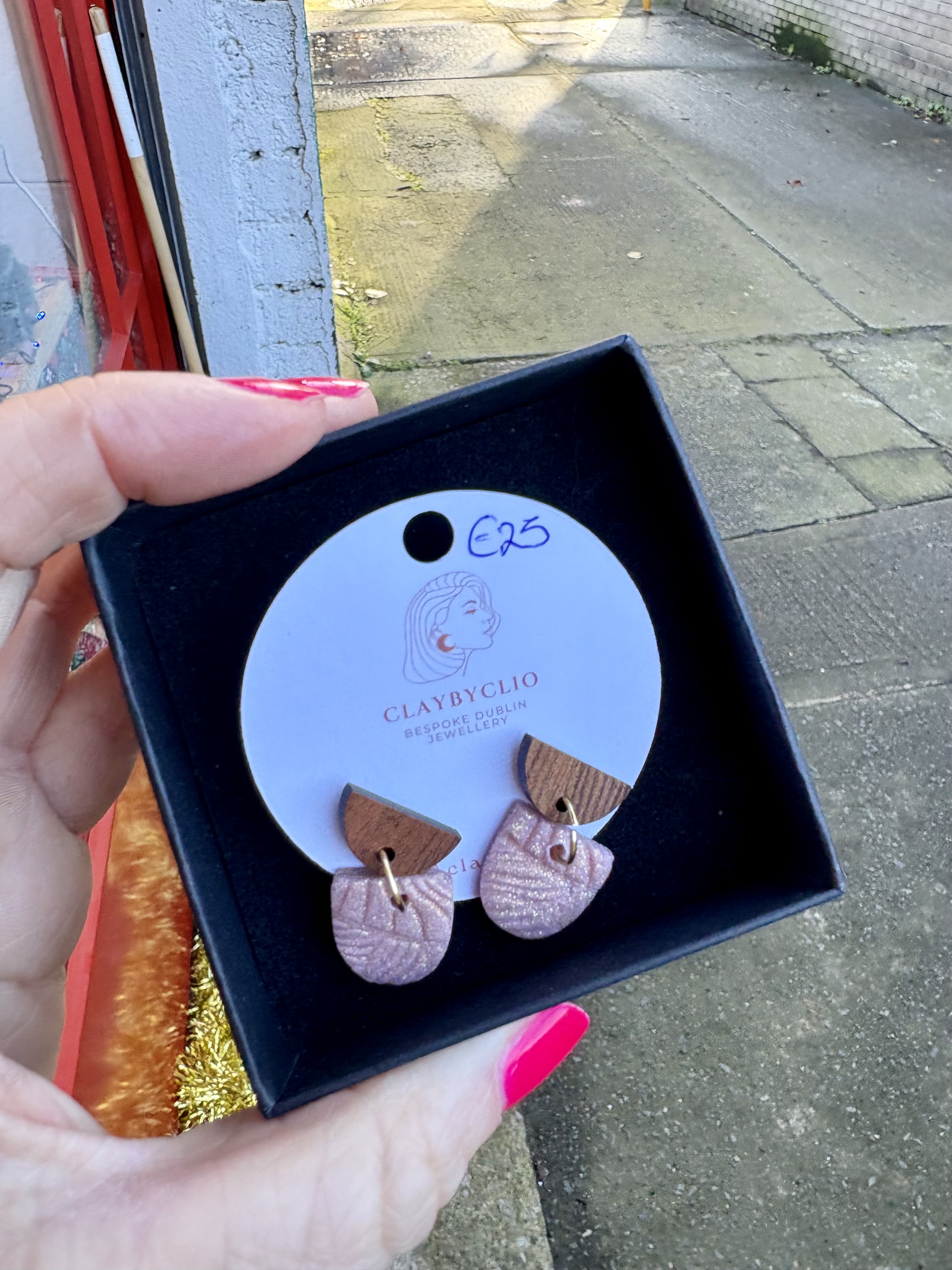 She makes these gorgous earrings in very small batches to keep them unique. Clio works with polymer clay and says to always store them in a box if traveling to protect, never stack or crush. The fixings and findings are all made from stainless steel. Comes in these gorgeous black gift boxes.